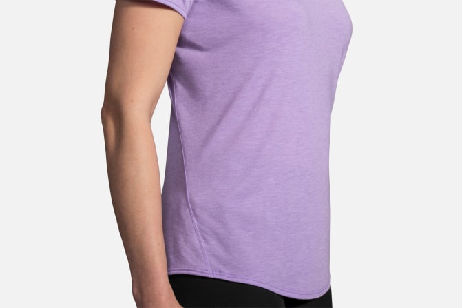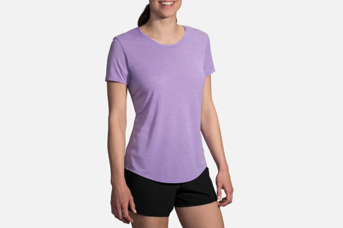 Brooks Women's Distance Short Sleeve Running Shirt keeps you dry and features soft comfort for everyday runs.